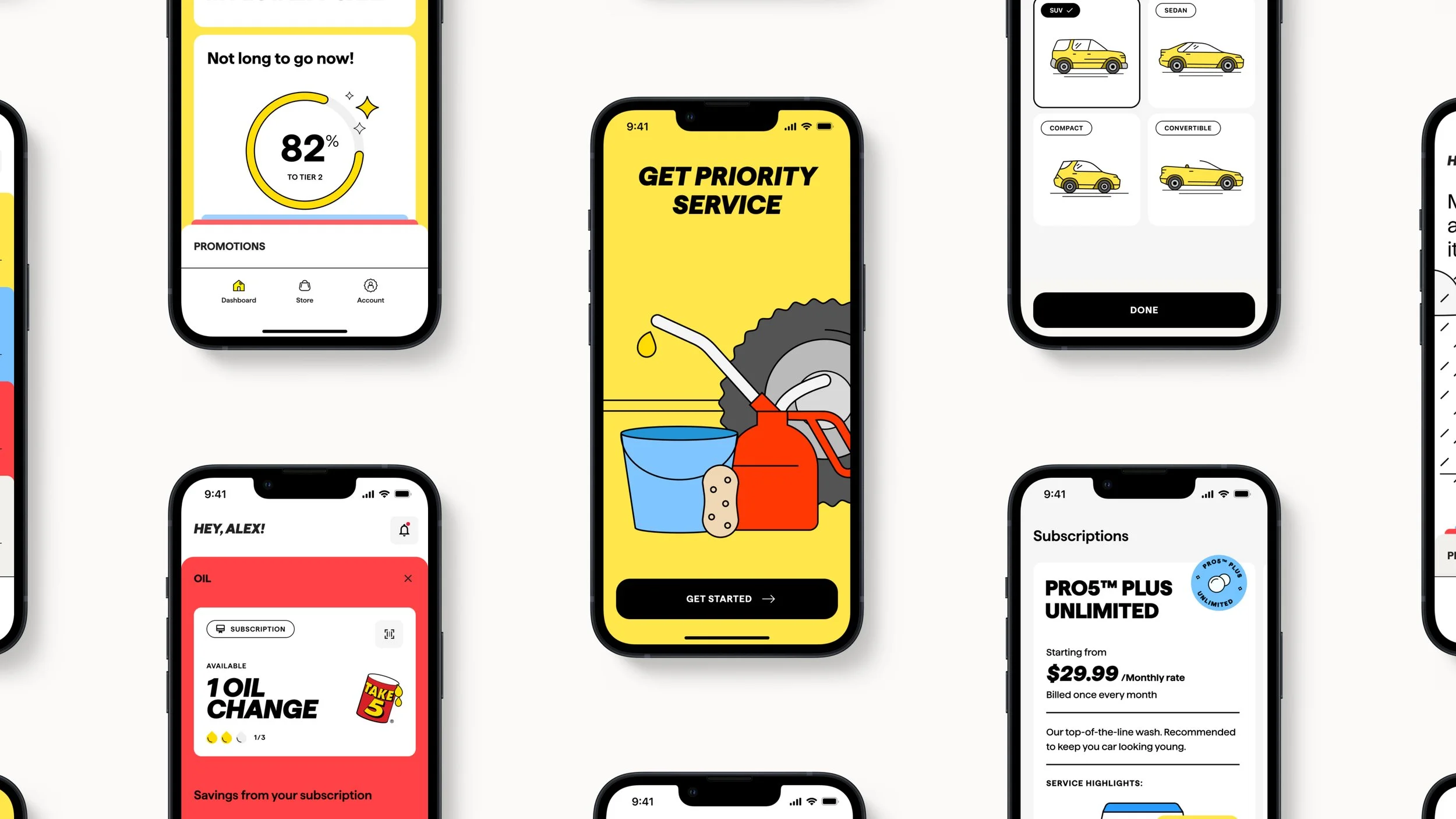 Senior Visual Designer for THE BRANDING AND APP DESIGN FOR TAKE5 OIL CHANGE AND CAR WASH REWARDS APP. we went through multiple rounds of revisions, and designed the logo, illustration style, and app design for driven brands new app.
